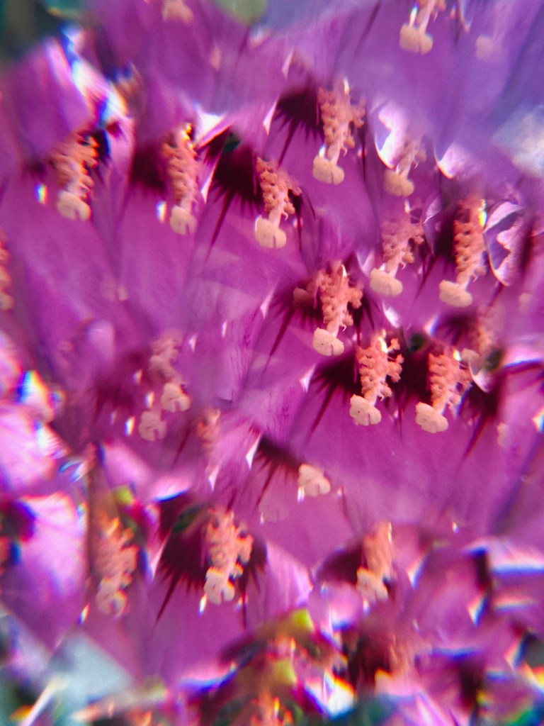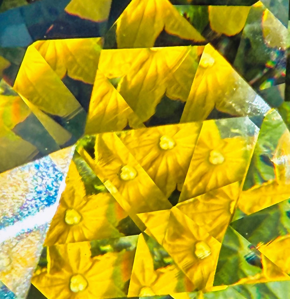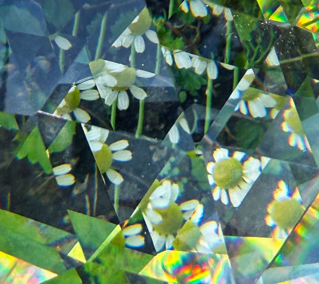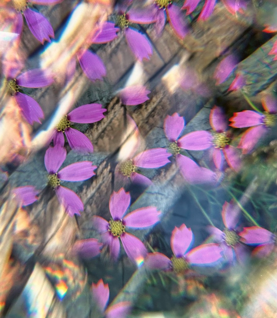 Surrounded by the natural beauty of my own yard; blooming flowers, textured leaves, and branches reaching toward the early summer light. I allowed the lens to distort and reimagine what I saw. The angle of the tool dramatically transformed each scene, scattering light and bending shapes in mesmerizing ways. Some of the most compelling results emerged when delicate rainbows appeared across petals, or when repeated floral patterns emerged in unexpected symmetry, echoing the geometry of a true kaleidoscope.